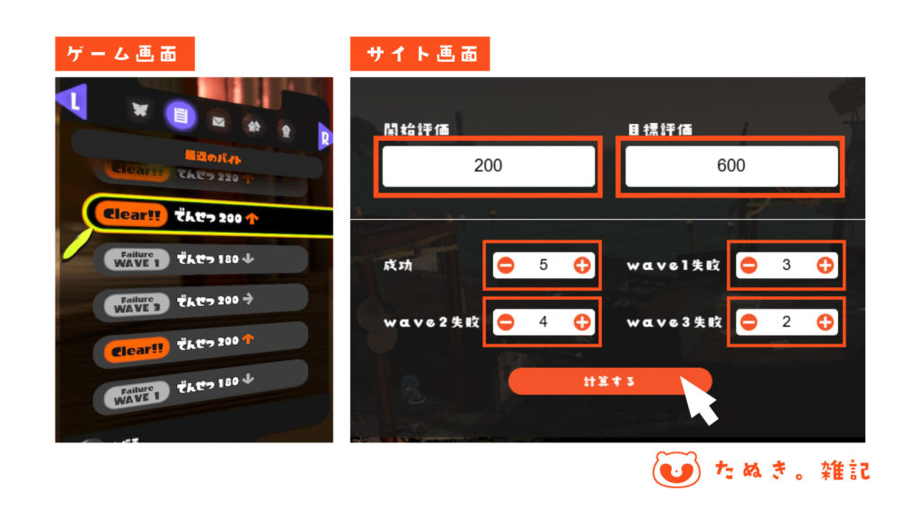 バイト結果を見ながら、サイトの入力欄に必要事項を入力し、計算するボタンを押します。
