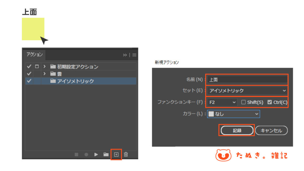 1.上面用の図を選択した状態で、新規アクションを追加のパネルに必要事項を記入し、『記録』をクリックします。