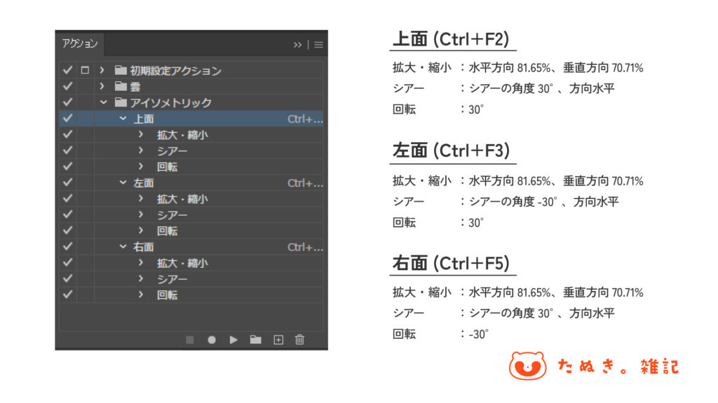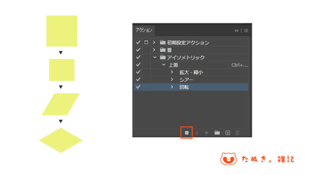 3.アクションパネルから記録を中止します。これでアイソメトリックイラスト上面用のアクション登録ができました。