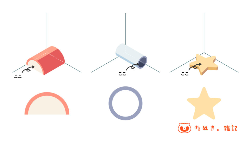 かまぼこの半円の面、塩ビパイプの穴が空いてる面、星型クッキーの星の面がこれに当たります。