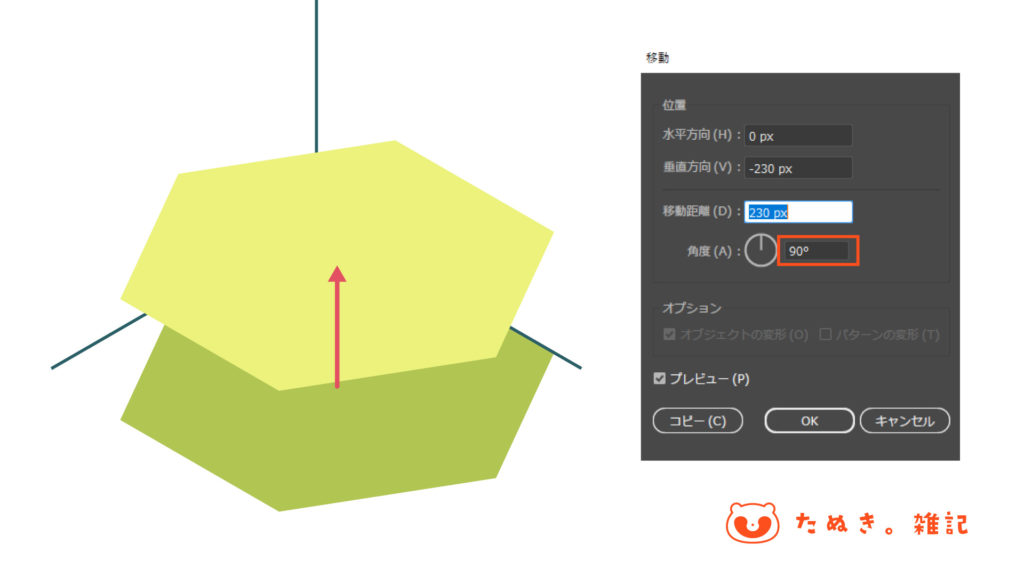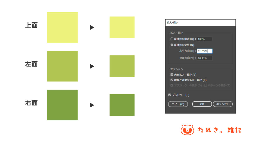 • オブジェクト > 変形 > 拡大・縮小:水平方向81.65%、垂直方向70.71%