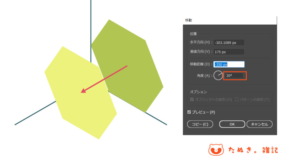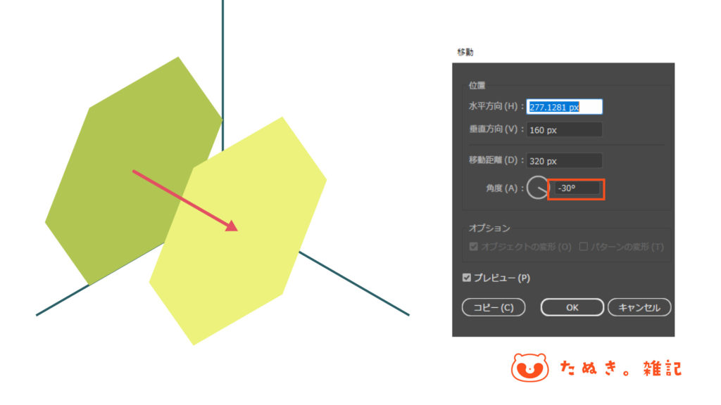 • 上面:オブジェクト > 変形 > 回転:-30°