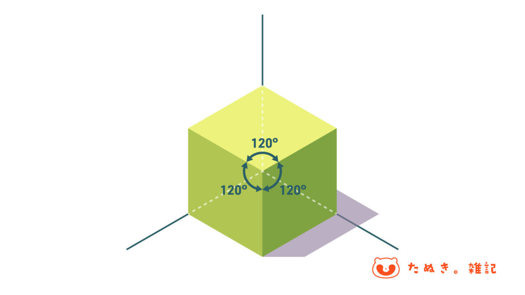 アイソメトリックイラストは、上下、左右、奥行きの3つの座標軸が120°で交わります。