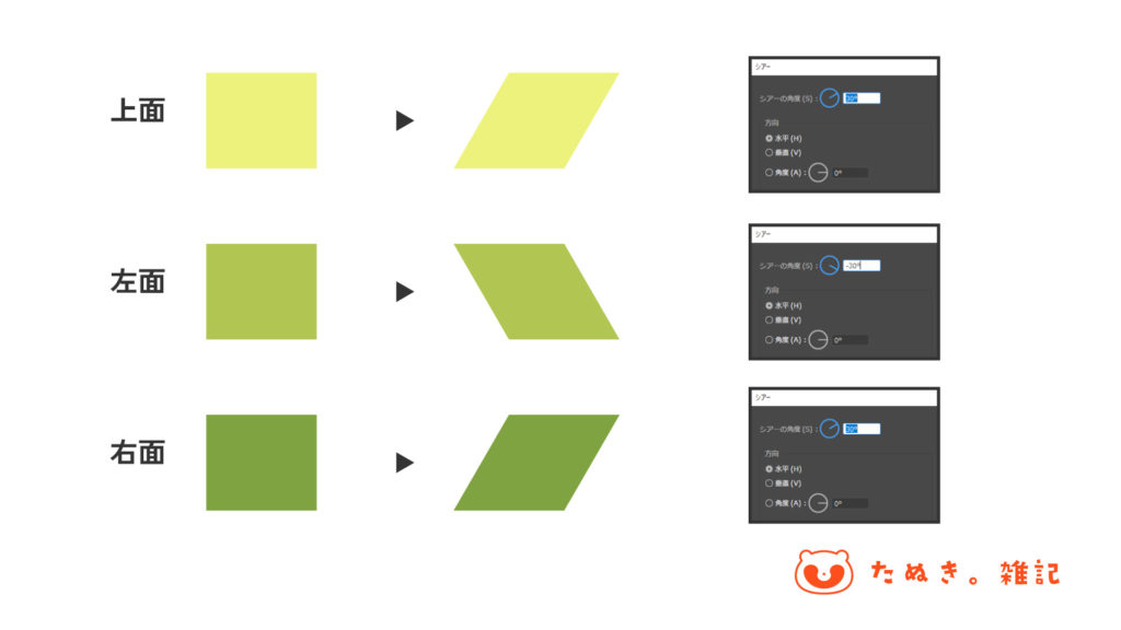 • 右側面:オブジェクト > 変形 > シアー:シアーの角度30°、方向水平