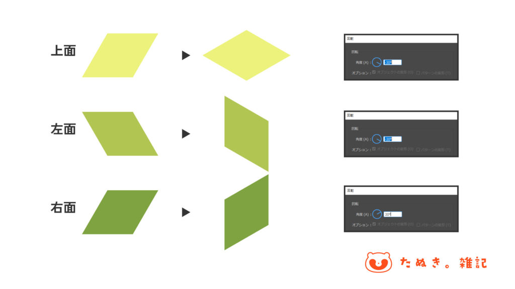 • 左側面:オブジェクト > 変形 > シアー:シアーの角度-30°、方向水平