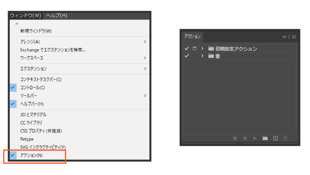 次にウィンドウ>アクションにチェックを入れアクションパネルを表示します。